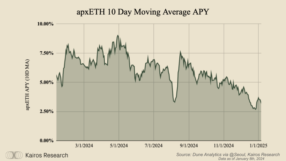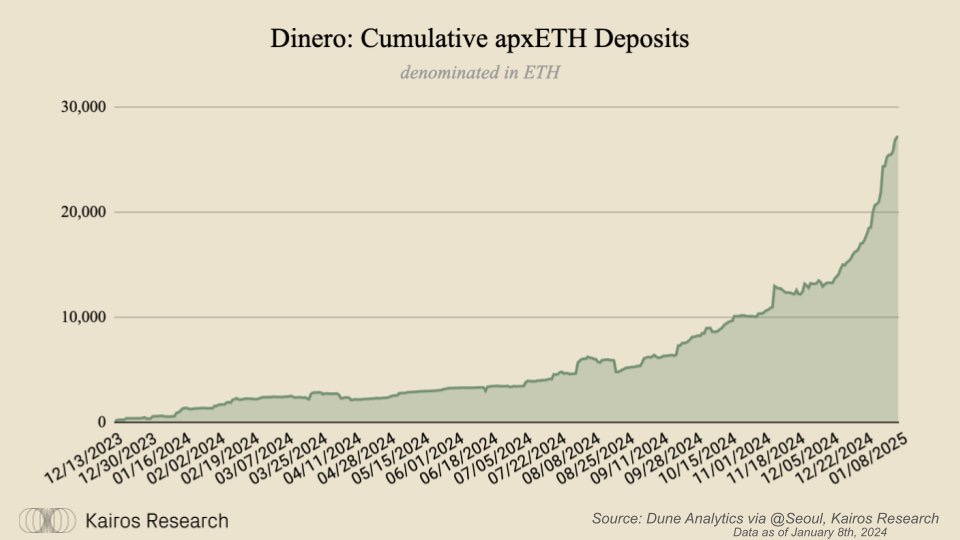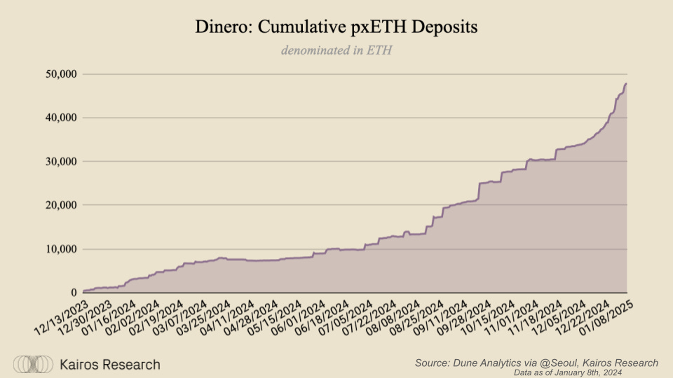As seen below, Dinero has started 2025 strong seeing some of its fastest growth in ETH terms for their liquid staking product. Since January 1st, pxETH’s TVL has seen a 13.6% increase. Since December 1, 2024, pxETH’s TVL is up over 49%. apxETH’s growth is likely reflexive, given the boosted yield encourages deposits and increased deposits increases economic activity across pxETH pairs, such that the yield remains boosted for apxETH. Continued Dinero growth alongside a strong year for ETH and other crypto assets could make it very possible for Dinero to surpass the billion dollar in deposit mark. As of today, Dinero is the 13th largest Ethereum liquid staking protocol - check out DeFiLlama’s ranking to see their nearby competitors.