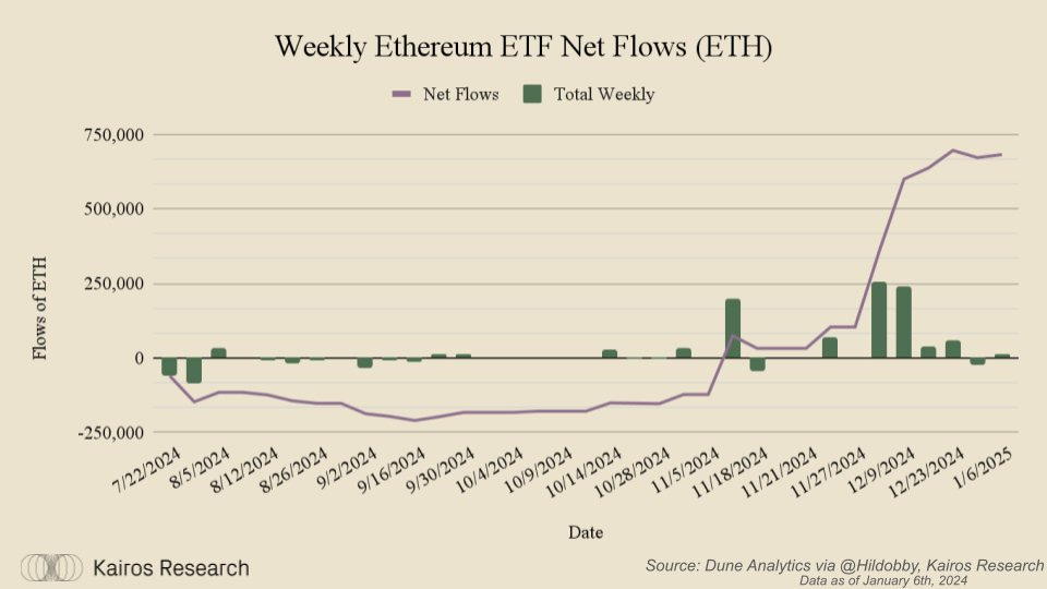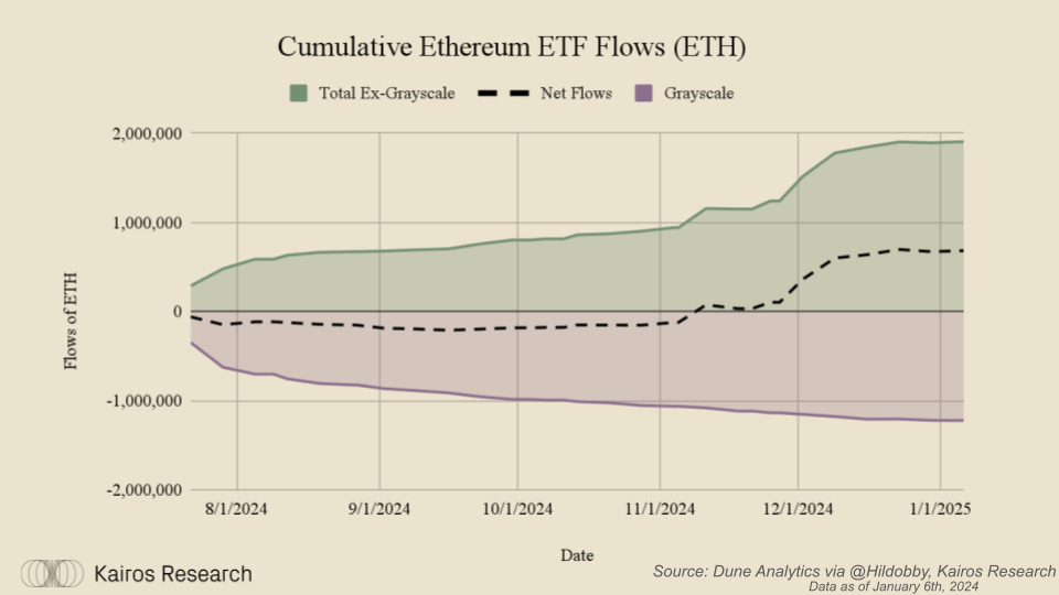 The Ethereum ETFs are currently undergoing a delayed version of the Bitcoin ETF process, where Grayscale muted the impact of inflows as investors trapped in their trusts fled after years of being locked. We can see in the image above, that at the beginning of December, ETH ETF flows flipped positive and we believe that they won’t look back. There is clear institutional demand for ETH and we predict that the conversation around ETH ETFs staking their assets under management will be highly relevant in 2025 and 2026.
