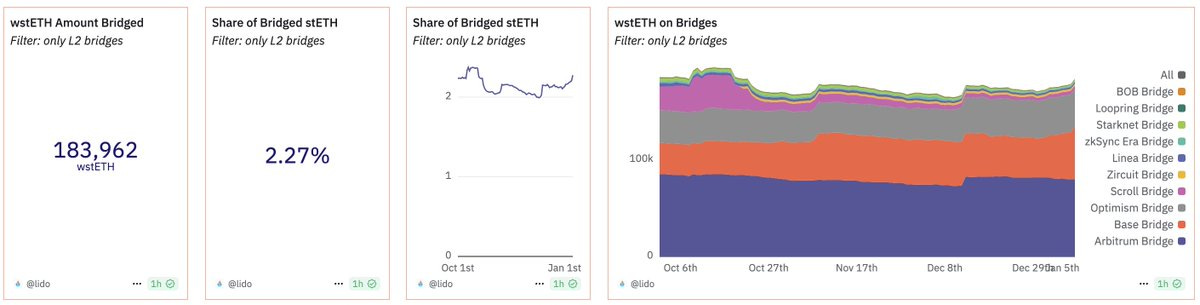 As more and more activity moves to Layer 2 networks, a vast amount of the LST supply will also find itself migrating to scaling solutions. We believe that a differentiated product with a strong focus on LST integration across L2s will prove to be not only fast growing, but also sticky. As seen in the Dune Analytics query below, ~$619M worth of Lido Staked ETH has been bridged to L2s - a number that increased by nearly 11.2% over the past month. Over the next couple of years we expect to see exponential growth in LSTs across scaling solutions as liquidity deepens on Arbitrum, Base, Optimism and other staking / restaking focused L2s like Swell and Scroll.