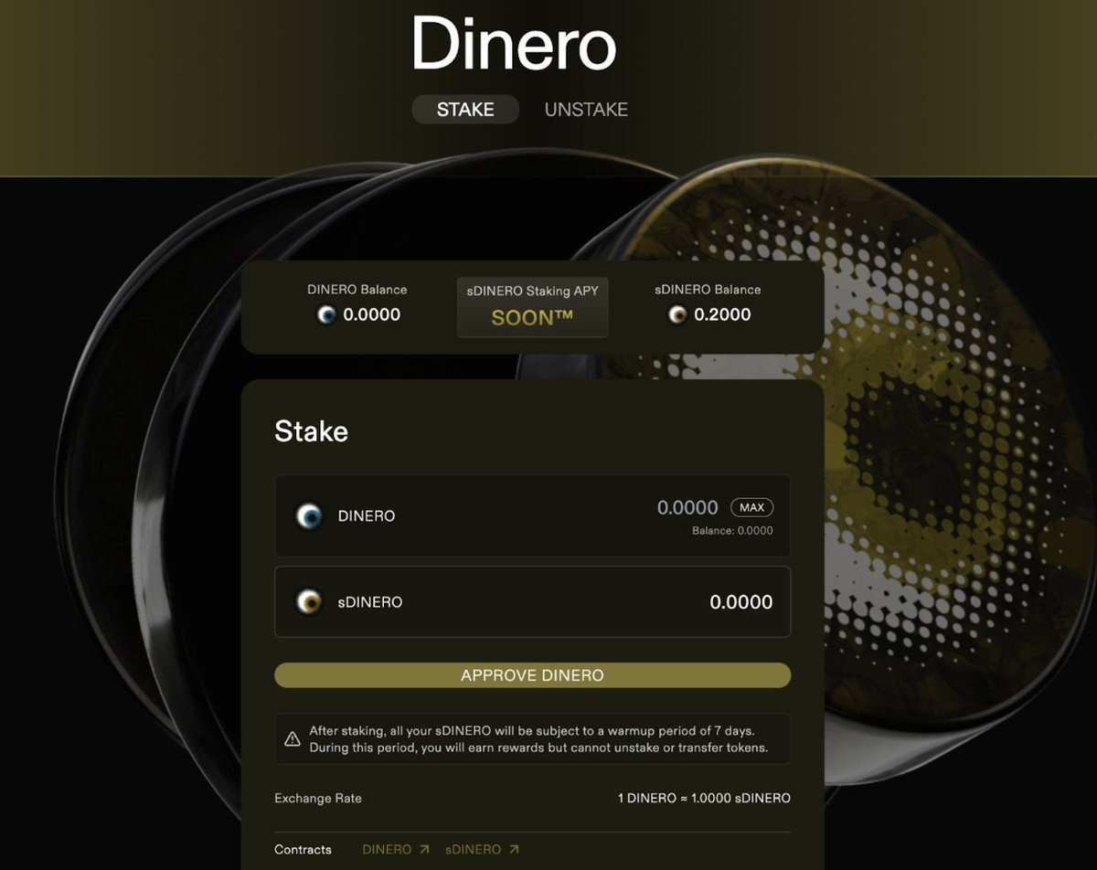 At the time of writing, sDINERO is paying out roughly 13.6% APR and 30.6% of the total token supply is staked. This translated to around a current run rate of $4M in annual payouts to DINERO stakers - which comes from a mix of protocol earnings and inflationary incentives. As noted in the linked blog post, the earnings are converted to DINERO and paid out to stakers